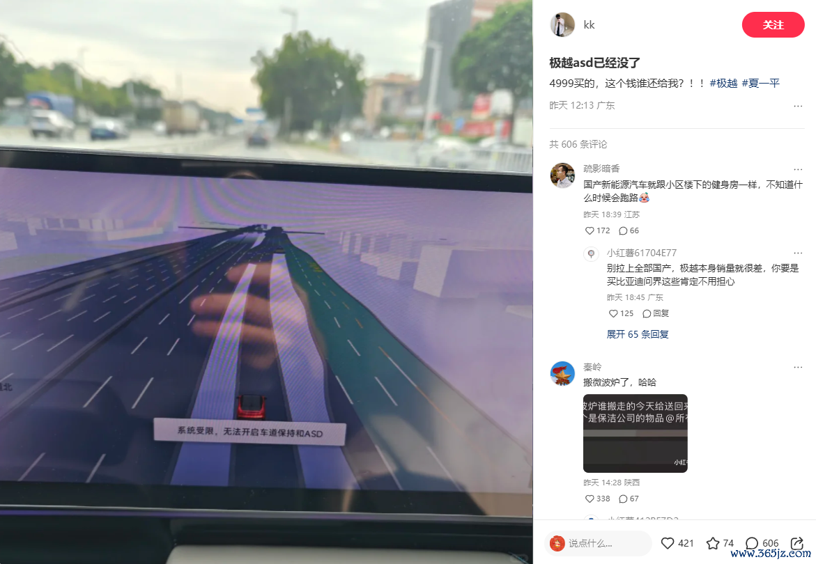 最惨的莫过于已提车的车主,部分车主示意,极越ASD高阶智驾如故不行用了。在车主展示的视频中,车机中控屏上线路“系统受限,无法开启车谈保持和ASD”,高阶智驾功能失效。车主示意,这个ASD高阶智驾是他花4999元买的,“这个钱谁还给我?”。