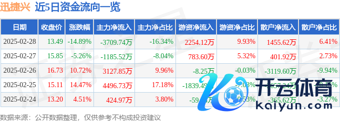本站音问,扫尾2025年2月28日收盘,迅捷兴(688655)报收于13.49元,下落14.89%,换手率12.35%,成交量16.47万手,成交额2.27亿元。